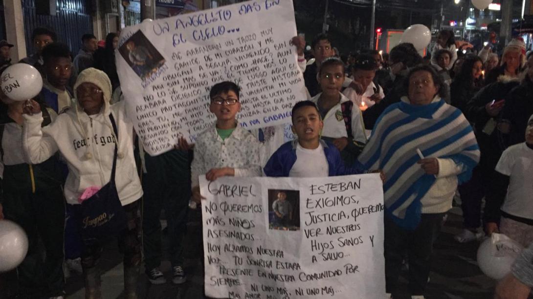 La brisa y el fuerte helaje que golpeaba a la ciudad en especial en Usme, no fue impedimento para que los presentes en especial los niños y compañeritos de colegio de Gabriel, caminaran con las pancartas que ellos mismos hicieron con cartulinas blancas y donde plasmaron su dolor a través conmovidas frases: “un angelito más en el cielo… me arrancan un trozo muy grande de mi corazón y me obligan a seguir viviendo sin ti. Hoy alzamos nuestra voz de protesta … tu sonrisa estará presente en nuestra comunidad por siempre, ni uno más, a un niño no se toca se respeta”.