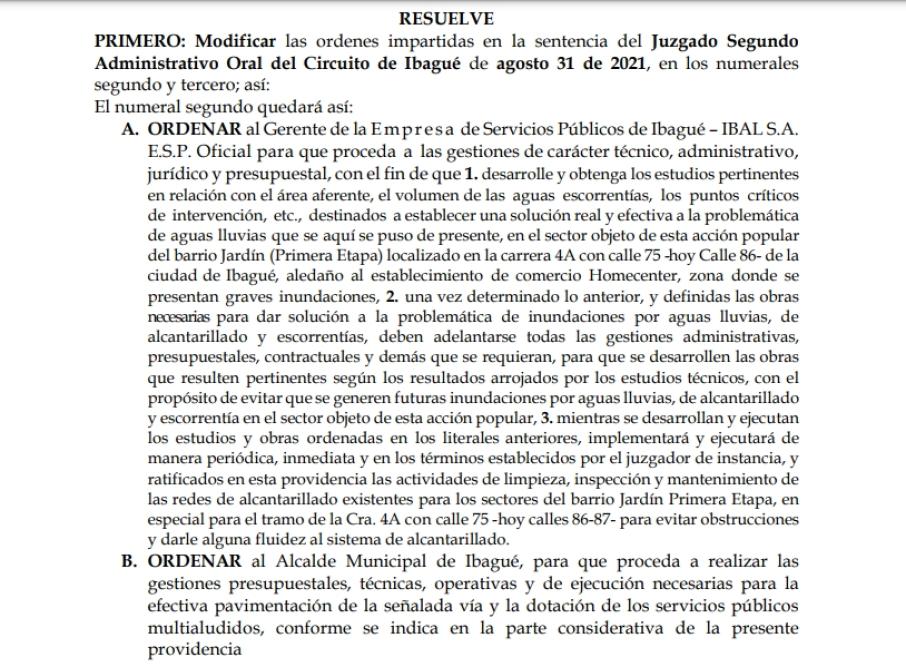 De igual forma el documento declara que; "Se ordena al Alcalde del municipio de Ibagué y al Gerente General de la Empresa Ibaguereña de Acueducto y Alcantarillado IBAL S.A. E.S.P. Oficial, para que, dentro de los 6 meses siguientes a la notificación del presente fallo adopten conjuntamente las medidas que aseguren que a más tardar dentro de los 18 meses siguientes: INSTRUYAN Y COORDINEN INTEGRALMENTE LA SOLUCIÓN DEL CONFLICTO que confluye en esta causa, a. implementen un programa de diseño conjunto y construcción de las obras -viales y de alcantarillado- que se ordenaron por el a quo y se acaban de precisar en esta sentencia, b. efectúen la fumigación y control de plagas en el sector e implemente un programa de control periódico con su respectivo cronograma, para contrarrestar focos infecciosos el cual deberá implementarse hasta cuando las obras ordenadas por el a quo sean realizadas", agrega el fallo.