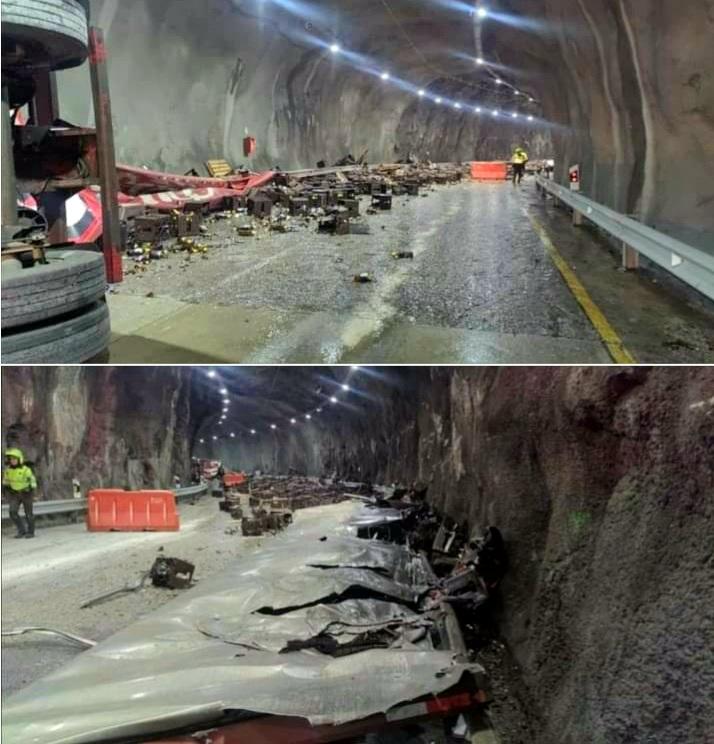 Cientos de latas de cerveza, hierros retorcidos, un olor intenso a caucho quemado y vidrios por todo lado, fue lo quedó del tremendo accidente donde un pesado tractocamión que se dirigía hacia Villavicencio, se volcó en el interior del túnel de Quebrada Blanca dejando taponado el paso de vehículos.