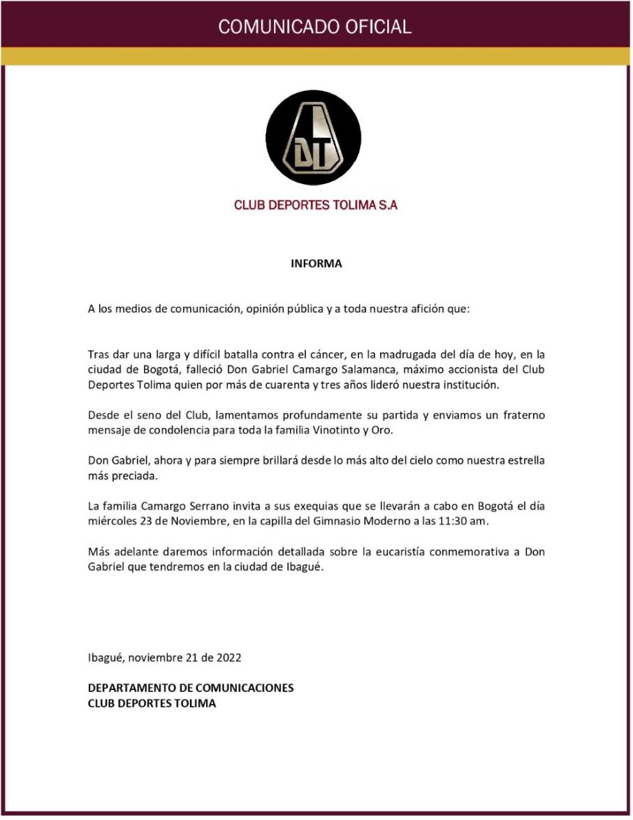Hace algunos minutos la cuenta oficial del Club Deportes Tolima acaba de confirmar el fallecimiento del que fuese el presidente y máximo accionista del equipo pijao, Gabriel Camargo Salamanca, luego de su extensa lucha contra un cáncer que lo obligó a retirarse de la escena pública.
