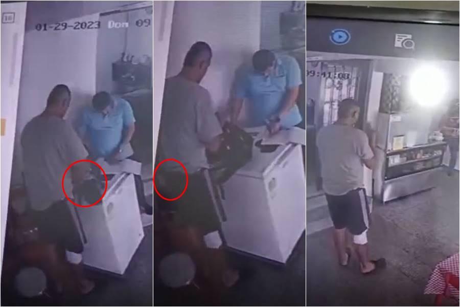 Video: cámara de seguridad de la lechonería, en el segundo seis se puede que el sujeto al parecer saca el celular del bolso y se lo guarda.