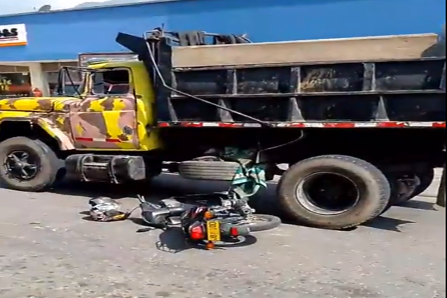 Una volqueta dejó practicamente destruída una motocicleta que transitaba en el sector de la Carrera quinta frente al supermercado Surtiplaza, donde al parecer la moto trataría de adelantar 2 vehículos quedando aprisionada en medio del vehículo de carga pesada.