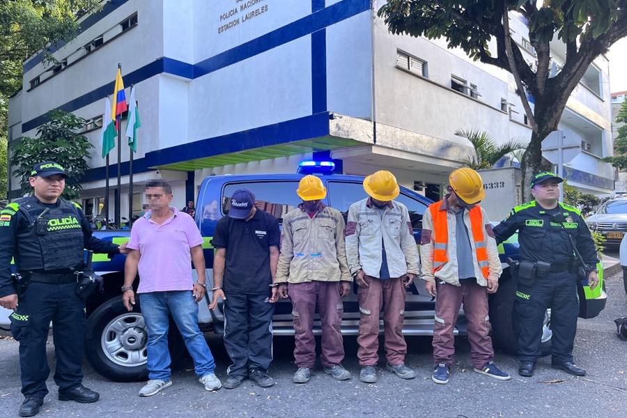 Cinco personas fueron capturadas por el delito de hurto mientras utilizaban uniformes de las Empresas Públicas de Medellín (EPM) en la carrera 84 con calle 44, en Medellín. La comunidad alertó a la línea de emergencia 123 sobre individuos levantando una placa de acero utilizada para paso peatonal.