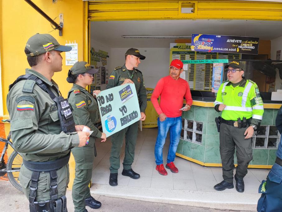 Estas acciones se han implementado por medio de charlas y entrega de volantes en las comunidades de barrios, sector comercio y lugares de afluencia de público, impactando más de 500 personas, a quienes se les dio a conocer la línea gratuita nacional 165 del Gaula de la Policía, para denunciar llamadas extorsivas, así mismo el código QR para que conozcan modalidades de extorsión en implementen las siguientes recomendaciones.