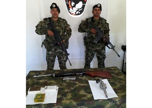 En desarrollo del Plan Victoria y cumpliendo el mandato constitucional, tropas del Batallón de Operaciones Terrestres N°18, unidad adscrita al Comando Operativo Zeus, lograron la incautación de dos armas y una gran cantidad de municiones en zona rural del municipio de Ataco, al sur del Tolima. El operativo de allanamiento se realizó en la vereda Polecito, de este municipio.