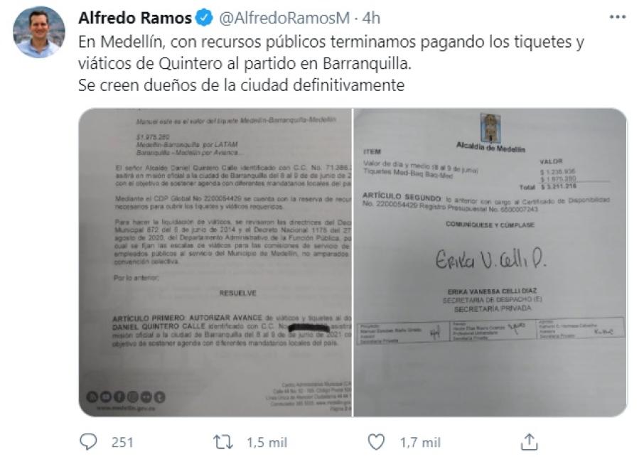 “En Medellín, con recursos públicos, terminamos pagando los tiquetes y viáticos de Quintero al partido en Barranquilla. Se creen dueños de la ciudad definitivamente”, escribió el concejal.