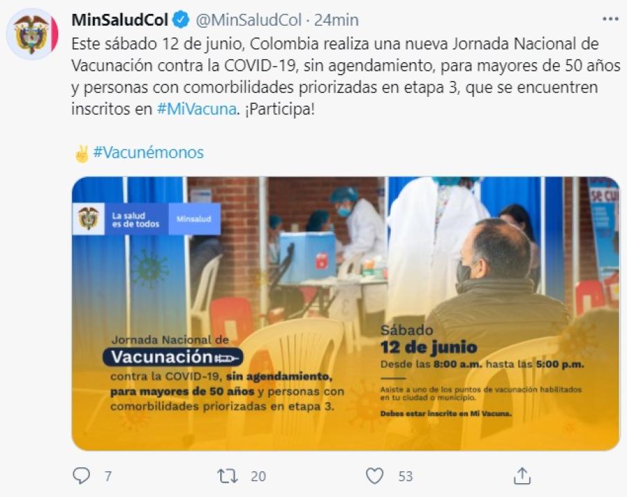 Por otra parte, el Ministro de Salud Fernando Ruiz hizo el llamado para que las personas mayores de 50 años que no han recibido la primera dosis, acudan a los diferentes puntos de vacunación para darle celeridad al plan nacional de vacunación y alcanzar más de 250.000 aplicaciones diarias.