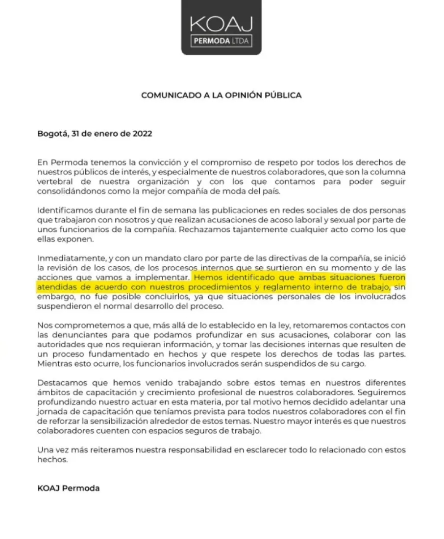 La marca de ropa Koaj reaccionó a las denuncias que se presentaron en redes sociales en contra de 2 de sus administradores en las que se indicaban que se estaría dando situaciones de acoso, tanto sexual como laboral.