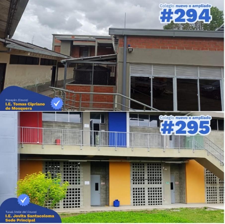 Así las cosas, el primer colegios entregado fue la I.E. Tomás Cipriano de Mosquera en Popayán, en el Cauca, que beneficiará a más de mil estudiantes gracias a la construcción de 9 aulas nuevas, un comedor con cocina escolar, 17 baterías sanitarias y una zona recreativa, obra que contó con una inversión superior a los $3.732 millones de pesos.