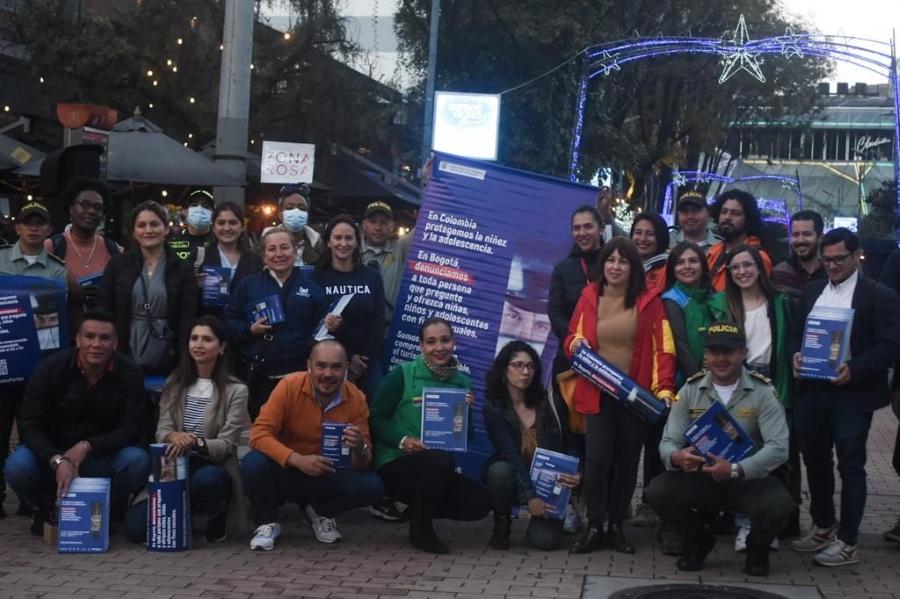 Las entidades realizaron un recorrido por la Zona T de Bogotá, una de las más representativas y turísticas de la capital, para llevar información de sensibilización a los turistas y personas del comercio sobre la importancia de ser garantes de la protección de la niñez y adolescencia, y que ante cualquier sospecha de un caso de ESCNNA deben reportarlo a la Línea Nacional 141.
