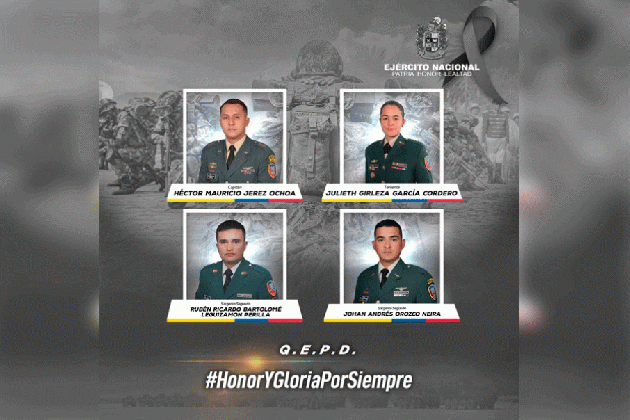 Las víctimas fueron identificadas como Héctor Jerez, la teniente Julieth García, y los sargentos segundo Johan Orozco, y Rubén Leguizamo.