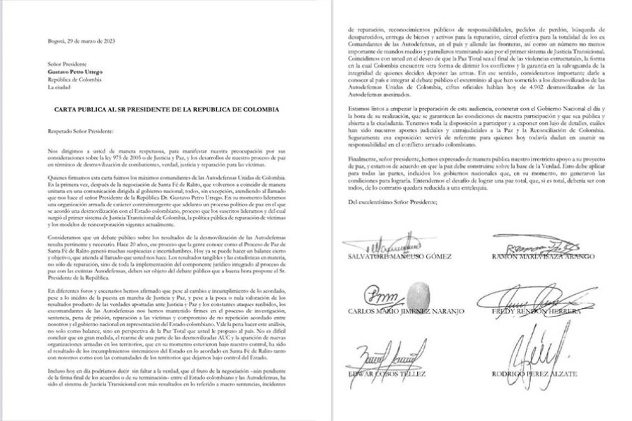 El escrito por parte de exjefes paramilitares, le solicitaron al Gobierno realizar un debate público sobre los resultados de la desmovilización de las autodefensas, de cara a la construcción de ‘paz total’.