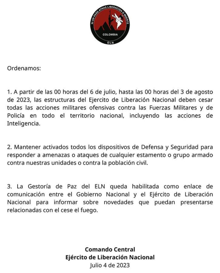 En cumplimiento de dicha orden, se instruye a todas las estructuras del Ejército de Liberación Nacional a cesar todas las acciones militares ofensivas contra las fuerzas militares y la policía en todo el territorio nacional. Esto incluye también las acciones de inteligencia. Asimismo, se indica mantener activados todos los dispositivos de defensa y seguridad para responder a amenazas o ataques de cualquier grupo armado, tanto contra nuestras unidades como contra la población civil.