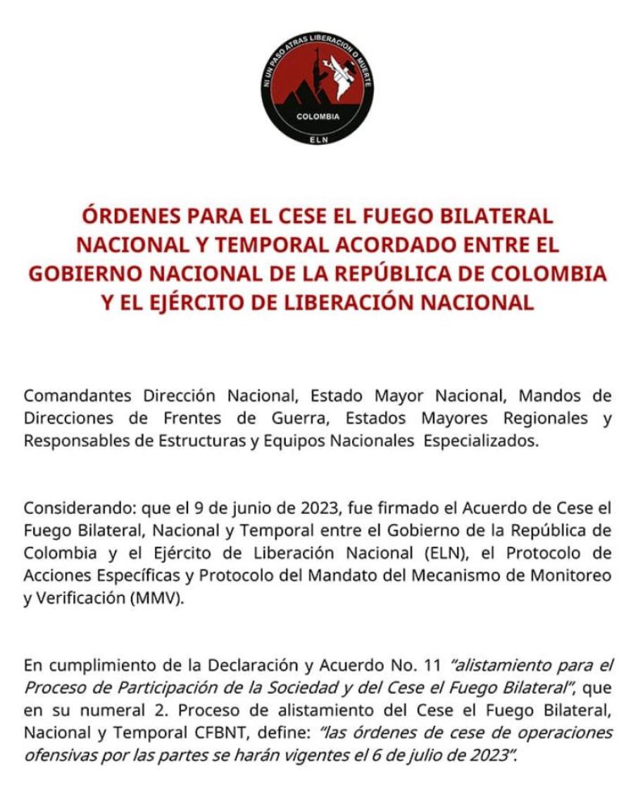 En un importante paso hacia la paz en Colombia, el pasado 9 de junio de 2023 se firmó el acuerdo de cese al fuego bilateral nacional y temporal entre el Gobierno de la República de Colombia y el Ejército de Liberación Nacional (ELN). Este acuerdo se enmarca dentro del protocolo de acciones específicas y el protocolo del mandato del mecanismo de monitoreo y verificación, en cumplimiento de la declaración de acuerdo número 11 sobre el proceso de participación de la sociedad en el cese al fuego bilateral.