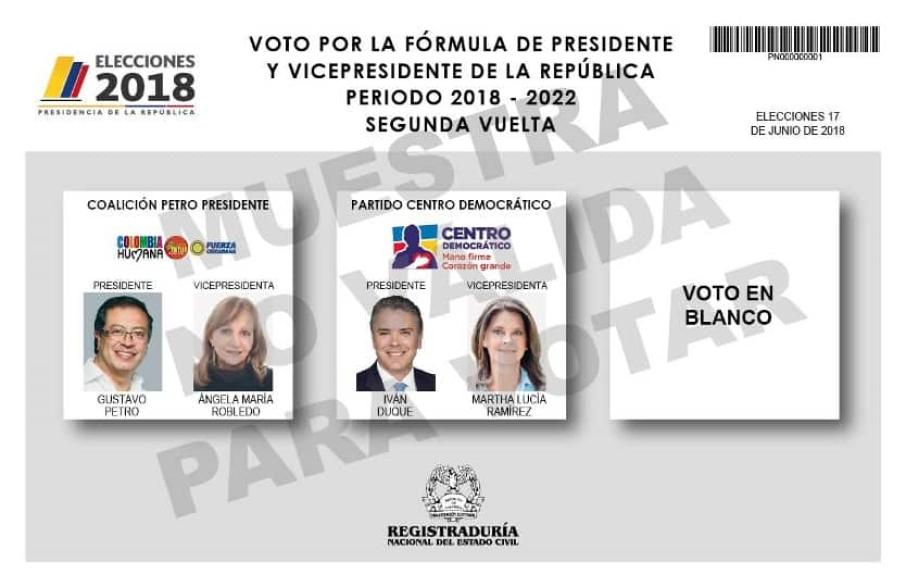 En el primer lugar del tarjetón estará Gustavo Petro junto a su fórmula presidencial Ángela María Robledo, luego, en la mitad aparecerá el candidato del Centro Democrático, Iván Duque, junto a Marta Lucía Ramírez, y al costado derecho estará la casilla del voto en blanco.