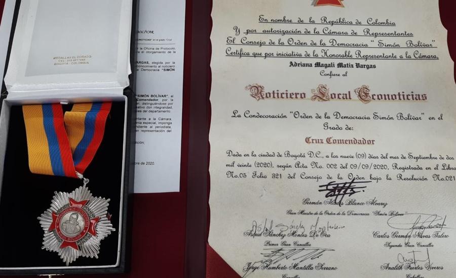 La representante a la Cámara, Adriana Magali Matiz, le entregó a Econoticias la Orden de la Democracia Simón Bolívar a través de la Resolución de Honores 021 del 2020 considerando que "ha logrado contribuir a la conservación del patrimonio cultural.