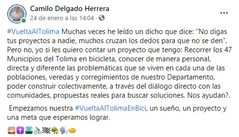 Delgado publicó el domingo pasado un mensaje en Facebook con el #VueltaAlTolima en el que anuncia que irá en bicicleta a todos los 47 municipios del Tolima, una forma muy particular de hacer campaña.