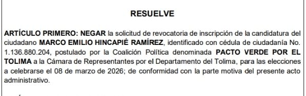 El Consejo Nacional Electoral negó la solicitud de revocatoria de la inscripción de Marco Emilio Hincapié Ramírez y confirmó su candidatura a la Cámara de Representantes por el Tolima para las elecciones del 8 de marzo de 2026.