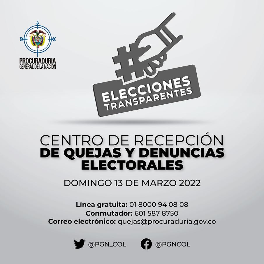 De esta manera, en el marco de brindar elecciones transparentes el órgano de control habilitó los siguientes canales para radicar quejas sobre la jornada electoral: línea gratuita 018000940808; conmutador 6015878750, el correo electrónico quejas@procuraduria.gov.co y las cuentas de los canales virtuales como el Twitter @PGN_COL con el hashtag #EleccionesTransparentes.