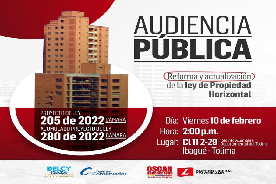 La representante conservadora, Delcy Isaza y el representante liberal, Óscar Hernández convocan a la participación de todos los tolimenses a la Audiencia Pública que se cumplirá en Ibagué el próximo 10 de febrero para escuchar las inquietudes de la comunidad respecto al proyecto de ley que establece entre otros aspectos la creación del Registro Único de Administradores de la Propiedad Horizontal.
