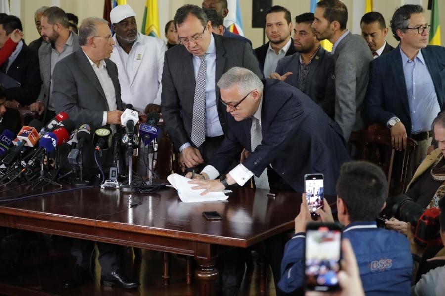 Los ministros de Justicia y del Derecho, Néstor Iván Osuna Patiño, y del Interior, Alfonso Prada Gil; la Oficina del Alto Comisionado para la Paz, en compañía de los presidentes de Senado, Roy Barreras, y de Cámara, David Racero; el presidente de la Comisión de Paz del Senado, Iván Cepeda, y los congresistas Ariel Ávila y Alirio Uribe, radicaron hoy ante el Senado el Proyecto de Ley 'Por la cual se establecen mecanismos de sujeción a la justicia ordinaria, garantías de no repetición y desmantelamiento de estructuras armadas organizadas de crimen de alto impacto y se dictan otras disposiciones'.