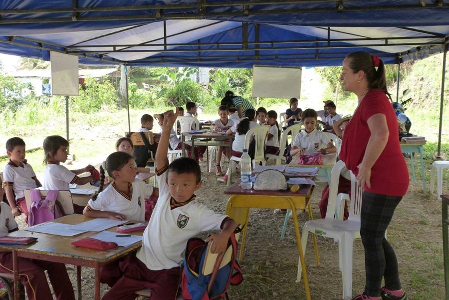 Recordemos que por ola invernal y las fuertes fallas geológicas se vio afectada la estructura de unos salones y hoy 34 niñas y niños de esta zona rural reciben clase a la interperie bajo una carpa.