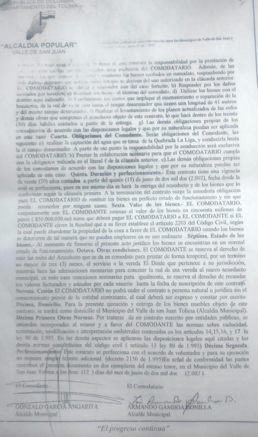 Frente al comodato que según el presidente de Junta fue firmado para el año 2002 por el alcalde de la época, se han presentado varias irregularidades donde ya se evidencian algunas causales de incumplimiento toda vez que es “viciado porque entre dos entidades gubernamentales no se puede hacer a más de 5 años y se hizo a 20 años, además, se hizo para el consumo humano y ya hay más de 75 piscinas para utilización recreacional y 200 mil pollo en San Luis que la usan, eso da Causal de incumplimiento del comodato”.