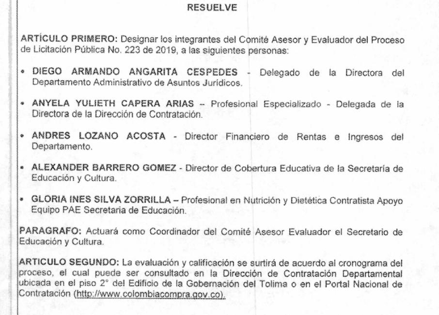 Solo (2) proponentes se presentaron a la licitación por $28.480 millones que adelanta la Gobernación del Tolima para la contratación del plan de alimentación escolar.
