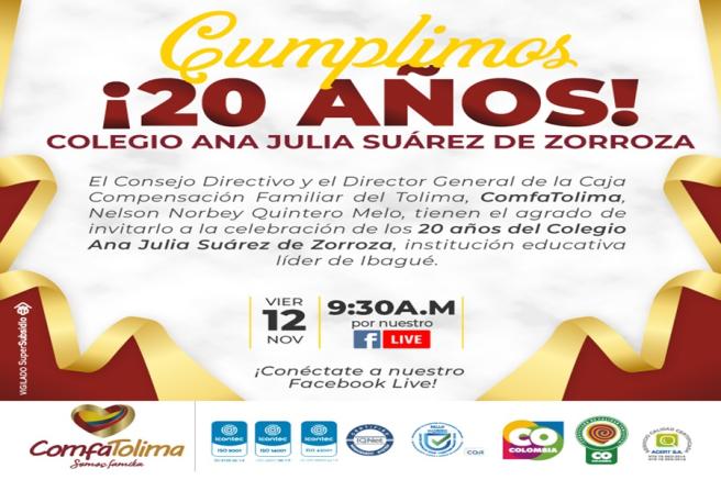 Contenido multimedia principal 20 años al servicio de la comunidad El colegio ComfaTolima Ana Julia Suárez de Zorroza se ha caracterizado por brindar educación de calidad.