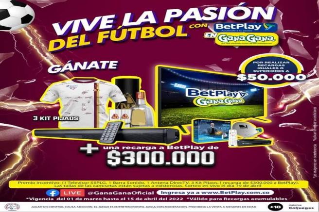 Contenido multimedia principal La pasión del fútbol en el Tolima se vive con BetPlay en GanaGana Por realizar recargas iguales o superiores a $50.000 participas por espectaculares premios.