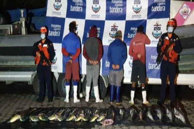 Contenido multimedia principal Armada Nacional capturó a 4 extranjeros realizando pesca ilegal En la inspección se hallaron once peces dorados, un pez marlín y siete tiburones sedosos.