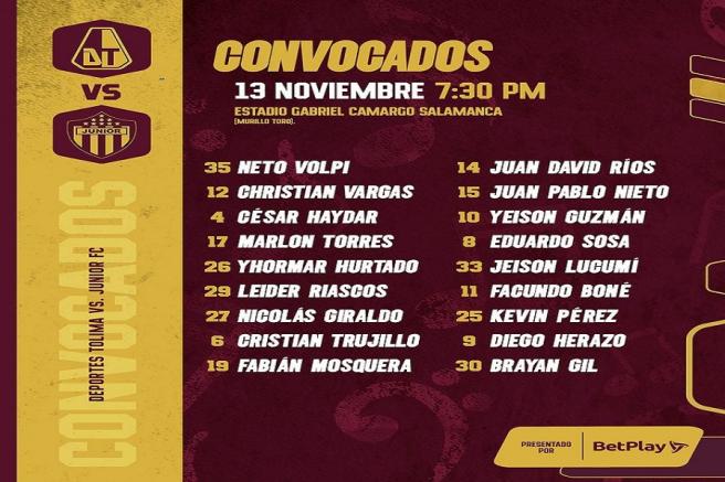 Contenido multimedia principal ¡Aquí los convocados! Deportes Tolima confirma nomina para enfrentar a Junior El juego a disputarse en el estadio Murillo Toro entre el Vinotinto y Oro frente al Junior de Barranquilla será este lunes festivo a las 7:30pm
