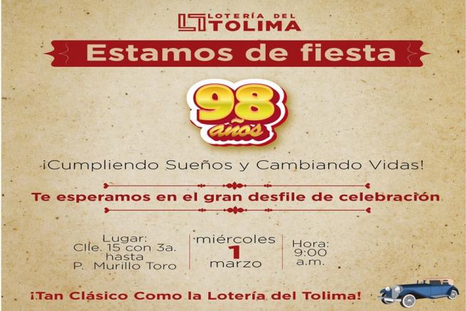 Contenido multimedia principal Todo preparado para los 98 años de la Lotería del Tolima Con un festejo denominado “Tan Clásico Como la Lotería del Tolima” esta entidad iniciará el Primero de marzo la celebración de su cumpleaños 98, y qui...