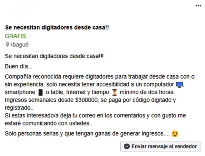 Contenido multimedia principal ¿Se ha encontrado con una oferta de trabajo en redes sociales en que solicitan ‘digitadores de códigos? Una atractiva oferta laboral se está haciendo viral en las redes sociales, básicamente ofertan un sueldo de 300 mil pesos semanales o más invirtiendo ...