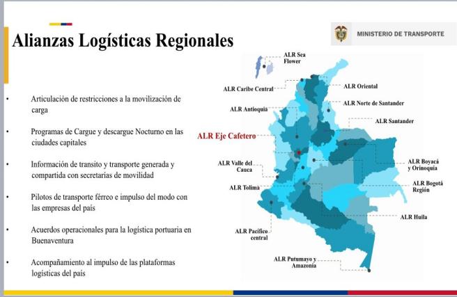 Contenido multimedia principal Así serán la alianza y perspectivas en la política nacional logística para el Eje Cafetero y el Tolima El Ministerio de Transporte socializó las proyecciones de la Alianza Logística Regional del Eje Cafetero y Tolima en el marco del nuevo plan de desarr...