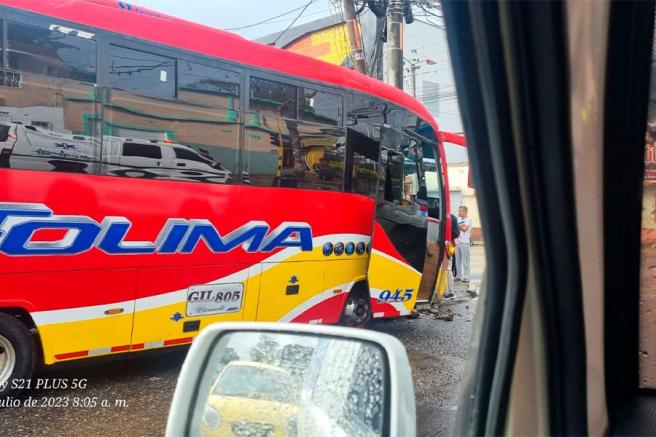 Contenido multimedia principal En video: detalles del accidente de un bus de Rápido Tolima Por pocos metros el bus termina su recorrido cuesta abajo tras chocar contra un poste.