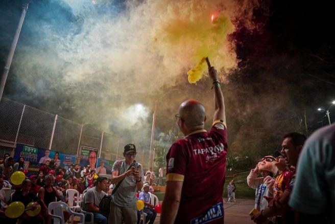 Contenido multimedia principal Barristas del Deportes Tolima reciben a Jorge Bolívar, quien también protagonizó multitudinaria manifestación en la Comuna Seis Un sector de liberales independiente también se sumaron a esa campaña.