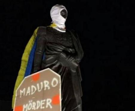 Contenido multimedia principal Estatua de Simón Bolívar fue encapuchada en Berlín como protesta contra Maduro A la figura se le puso un escudo que tenía el mensaje en alemán: “Maduro mörder diktator” (Maduro asesino dictador).