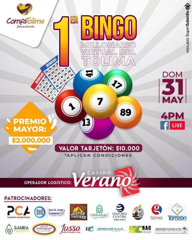Contenido multimedia principal ComfaTolima realiza el primer bingo millonario virtual del Tolima. El evento central de la caja de compensación para el mes de mayo pretende unir a las familias tolimenses en torno a este juego tradicional.