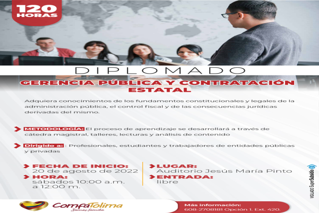Contenido multimedia principal Comfatolima dictará diplomado gratuito en Gerencia Pública y Contratación Estatal La educación no tendrá costo y se desarrollará de manera presencial a partir de sábado 20 de agosto.