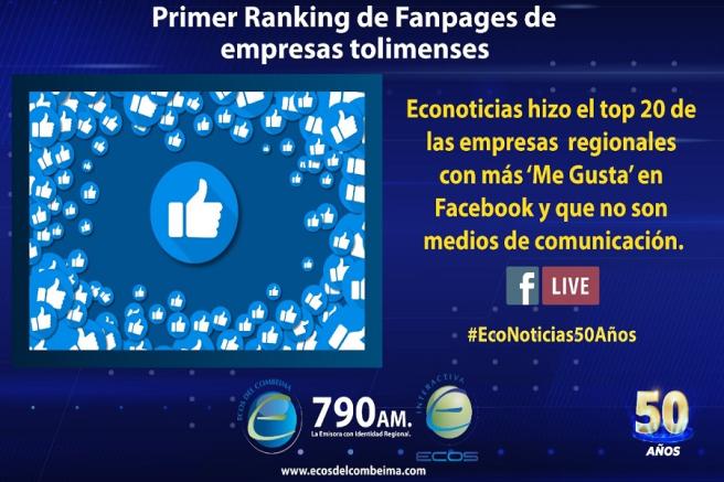 Contenido multimedia principal Primer Ranking de Fanpages de empresas tolimenses Econoticias hizo el top 20 de las empresas regionales con más ‘Me Gusta’ en Facebook y que no son medios de comunicación.