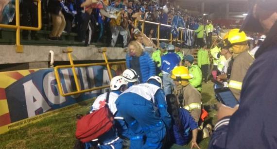 Contenido multimedia principal Vandalismo y emergencias en estadios de Colombia en la penúltima fecha En Villavicencio hinchas del Deportes Quindío invadieron la cancha armados con cuchillos y en Tunja hubo 12 heridos al ceder una baranda.