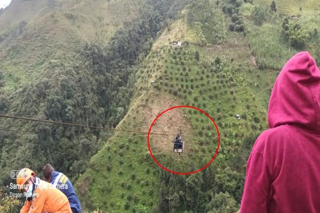 Contenido multimedia principal ¡Miedo en las alturas! En Herveo una 'garrucha' se descarriló y tres personas quedaron atrapadas Los ocupantes intentaban llegar a una finca cuando el medio de transporte sufrió la falla.