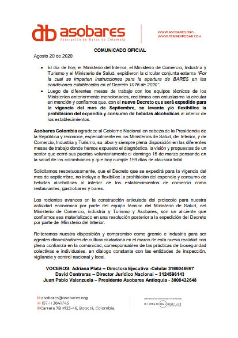 En su comunicado la asociación expresa: Asobares Colombia agradece al Gobierno Nacional en cabeza de la Presidencia de la República y reconoce, especialmente en los Ministerios de Salud, del Interior, y de Comercio, Industria y Turismo, su labor y siempre plena disposición en las diferentes mesas de trabajo donde hemos expuesto el diagnóstico, la visión y propuestas de un sector que cerró sus puertas voluntariamente el domingo 15 de marzo pensando en la salud de los colombianos y que hoy cumple 159 días de clausura total.