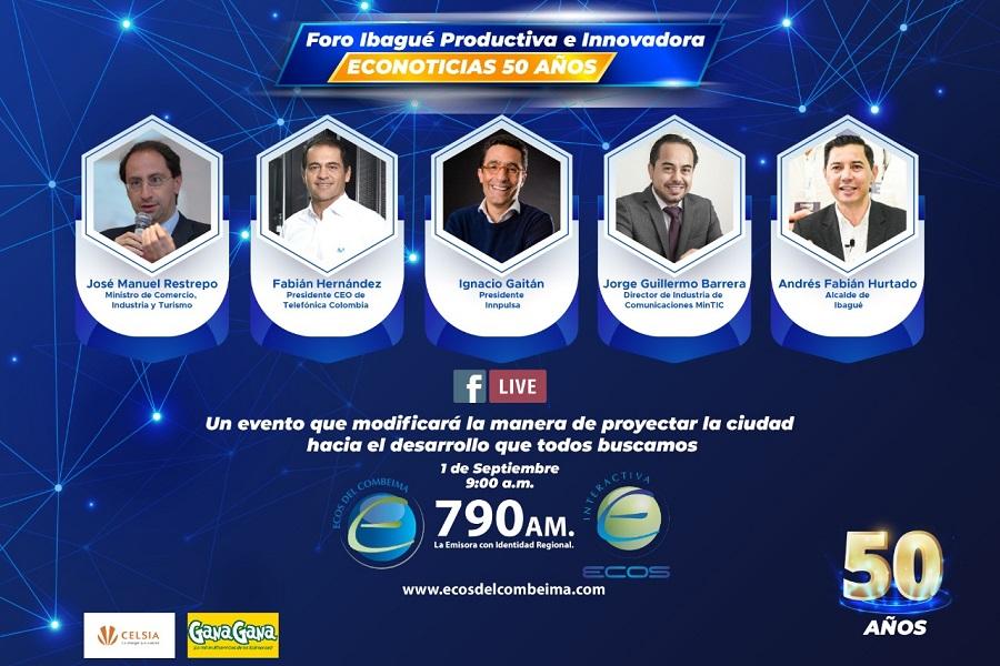 El Foro Ibagué Productiva e Innovadora Econoticias 50 años contará con la participación del ministro de Comercio, Industria y Turismo, José Manuel Restrepo; el presidente de INNpulsa, Ignacio Gaitán; el presidente CEO de Telefónica Colombia, el ibaguereño Fabián Hernández; el director de Industria del Ministerio de las TICs, Jorge Guillermo Barrera y el alcalde de los ibaguereños, Andrés Fabián Hurtado.