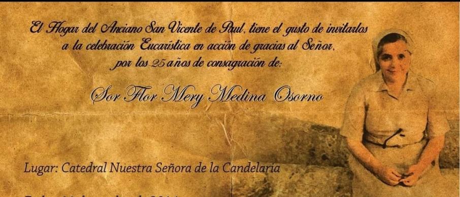 Desde la Emisora Ecos del Combeima, presentamos las condolencias al Jardín de los Abuelos, a la familia, relacionados y amigos de sor Flor Mery Medina Osorno tras su temprana partida y elevamos las plegarias a Dios para que la reciba en su lecho, le brinde el descanso eterno y la paz para su alma.