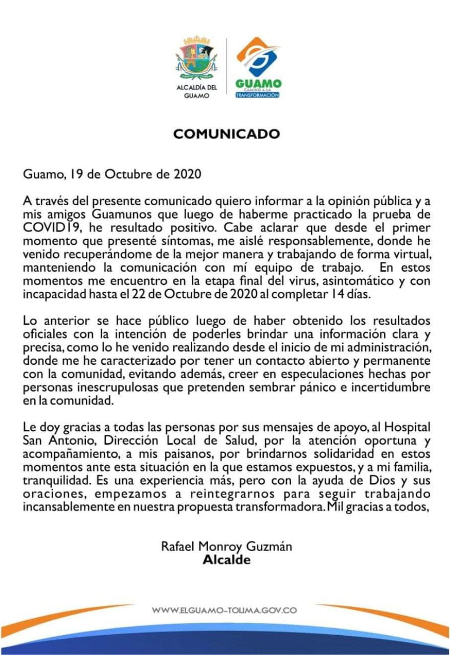En las últimas horas en el municipio de El Guamo se confirmó que el alcalde de esta localidad, Rafael Monroy, dio positivo para COVID-19, así lo dio a conocer mediante un comunicado a la opinión pública.