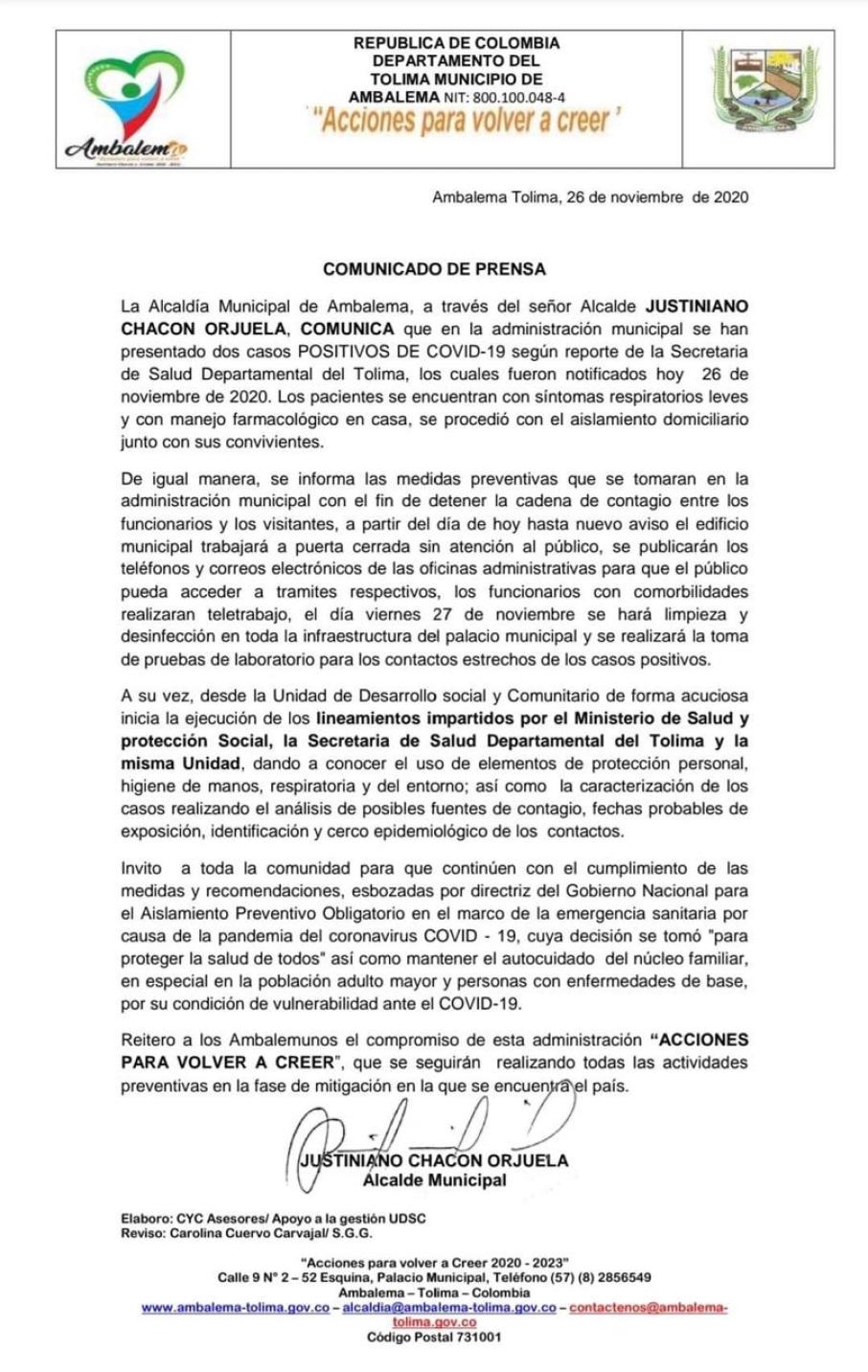 A través de un comunicado, la Alcaldía de Ambalema indicó que se presentaron dos casos del virus en su personal, los cuales fueron notificados por la Secretaría de Salud Departamental.