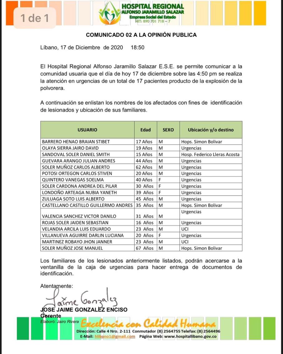 El secretario de Salud del Tolima, Jorge Bolívar, confirmó la explosión de una polvorería que dejó hasta el momento 17 personas heridas, tres de ellos menores de edad.