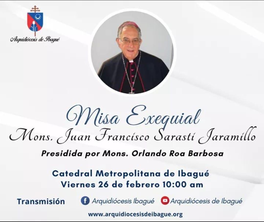 La Arquidiócesis de Ibagué se une a la oración por el eterno descanso de Monseñor Juan Francisco Sarasti, con la celebración de la Misa exequial, el viernes 26 de febrero, a las 10:00 am en la Catedral Metropolitana de Ibagué.